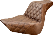 The Step-Up Seat with Full Lattice Stitch in Brown for Softail '18-'24 features Ultra-Foam’s cutting-edge molding that creates a water-resistant, self-sealing surface, enhancing both comfort and durability. It combines rider and passenger support with ergonomic design to keep you firmly locked in and in control. The GelCore* interior paired with Ultra-Foam delivers the perfect balance of firmness and flexibility. High lumbar support secures your position, while the whisper-grain SaddleHyde* cover adds a bold, rugged look. Installation is straightforward with all hardware and instructions included. Made in the USA to power your ride.