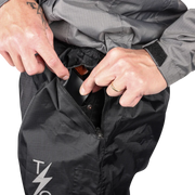 Hook-and-loop waist fitting straps, Water-resistant YKK zippers throughout, Heavy-duty PU coated nylon ripstop material, Fully taped seams ensure weatherproof protection, Pockets open up into inner layer for quick access, Heat-resistant material on lower inseam protects leg from exhaust, Lightweight and stow easily, Comes with a stuff pouch